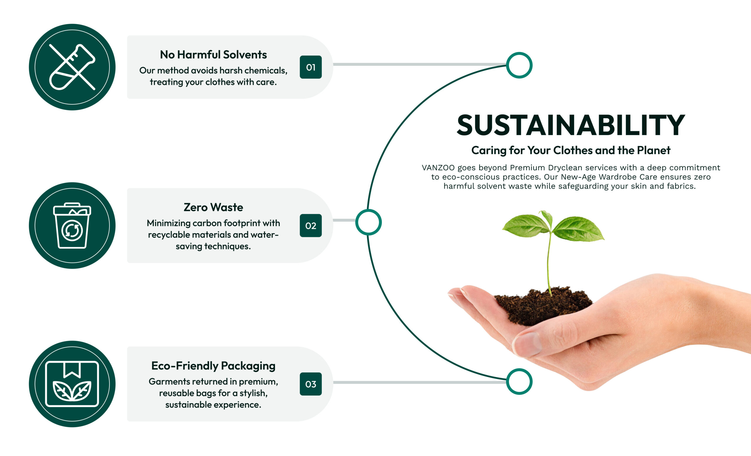 VANZOO specializes in luxury fabric care with a focus on eco-friendly practices. We use imported Italian hydrocarbon technology, which is gentle on fabrics and safer for the environment. Additionally, our door-to-door service, expert care, and focus on premium garments set us apart from traditional dry cleaners who uses manual processes or outdated technology which is harmful for the environment and your health.