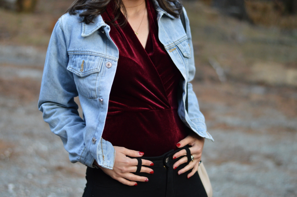 - Velvet blazer with denim and a cotton t-shirt